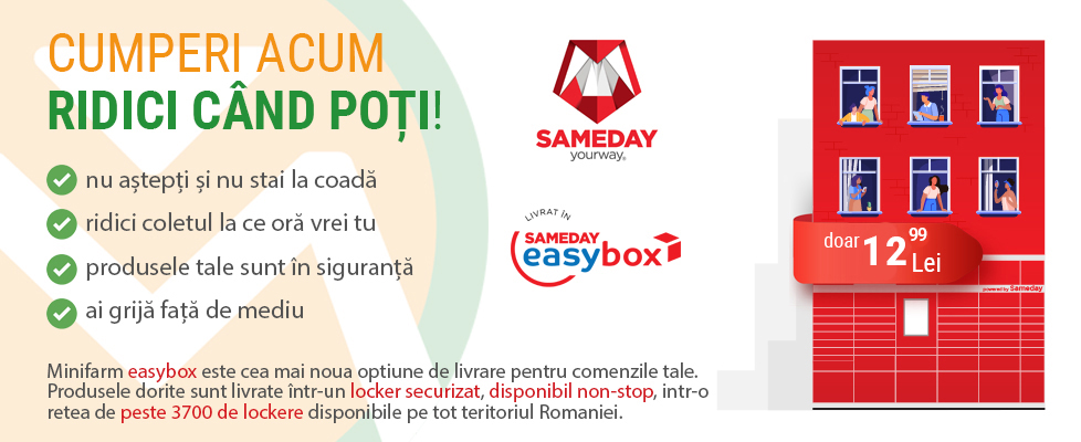 Minifarm easybox este cea mai noua optiune de livrare pentru comenzile tale. Produsele dorite sunt livrate într-un locker securizat, disponibil non-stop, intr-o retea de peste 3700 de lockere disponibile pe tot teritoriul Romaniei.