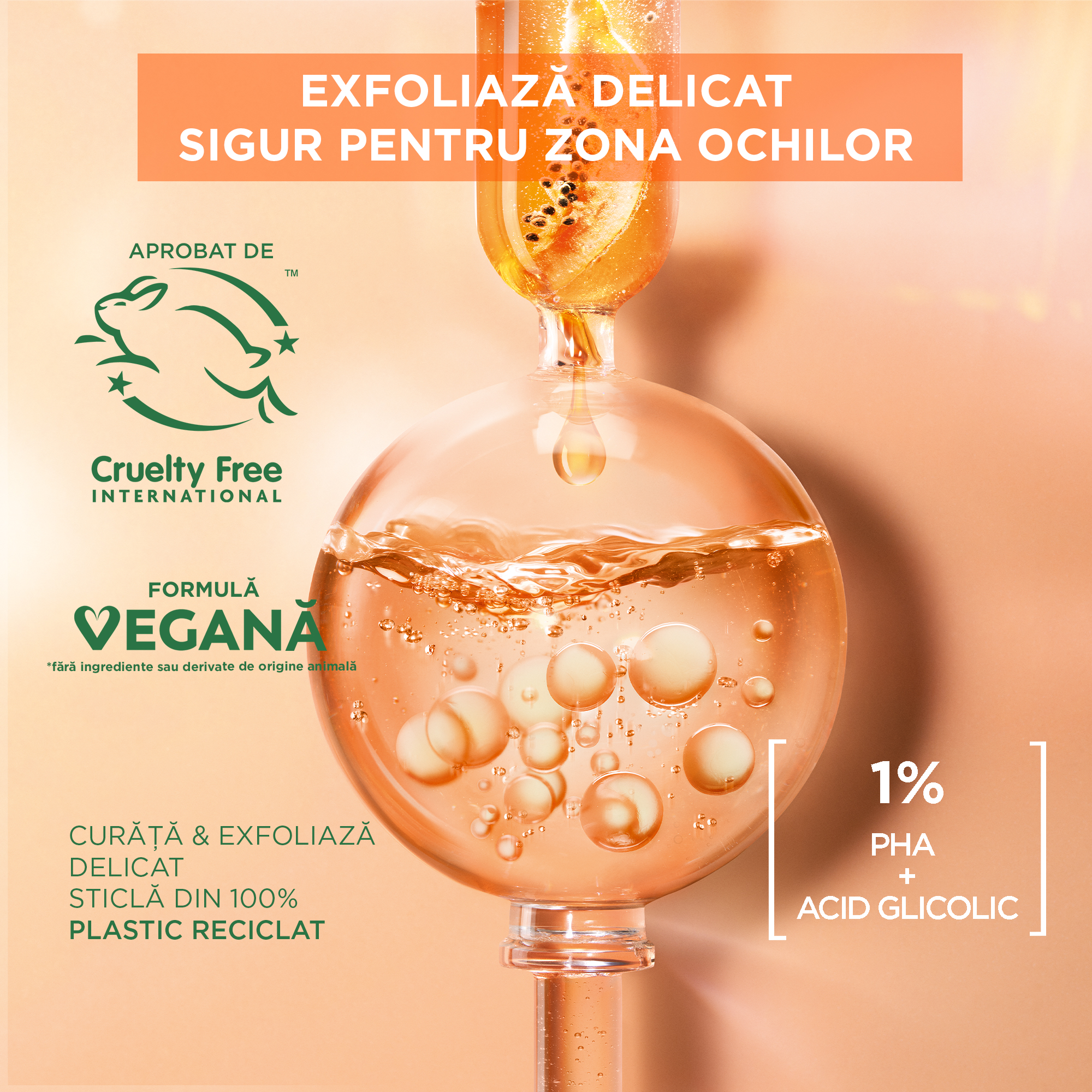 Formula imbogatita cu 1%PHA si Acid Glicolic: - curata tenul; - demachiaza; - exfoliaza delicat; Nu lasa reziduri vizibile* de produs in urma. Test consumatori, 137 persoane.