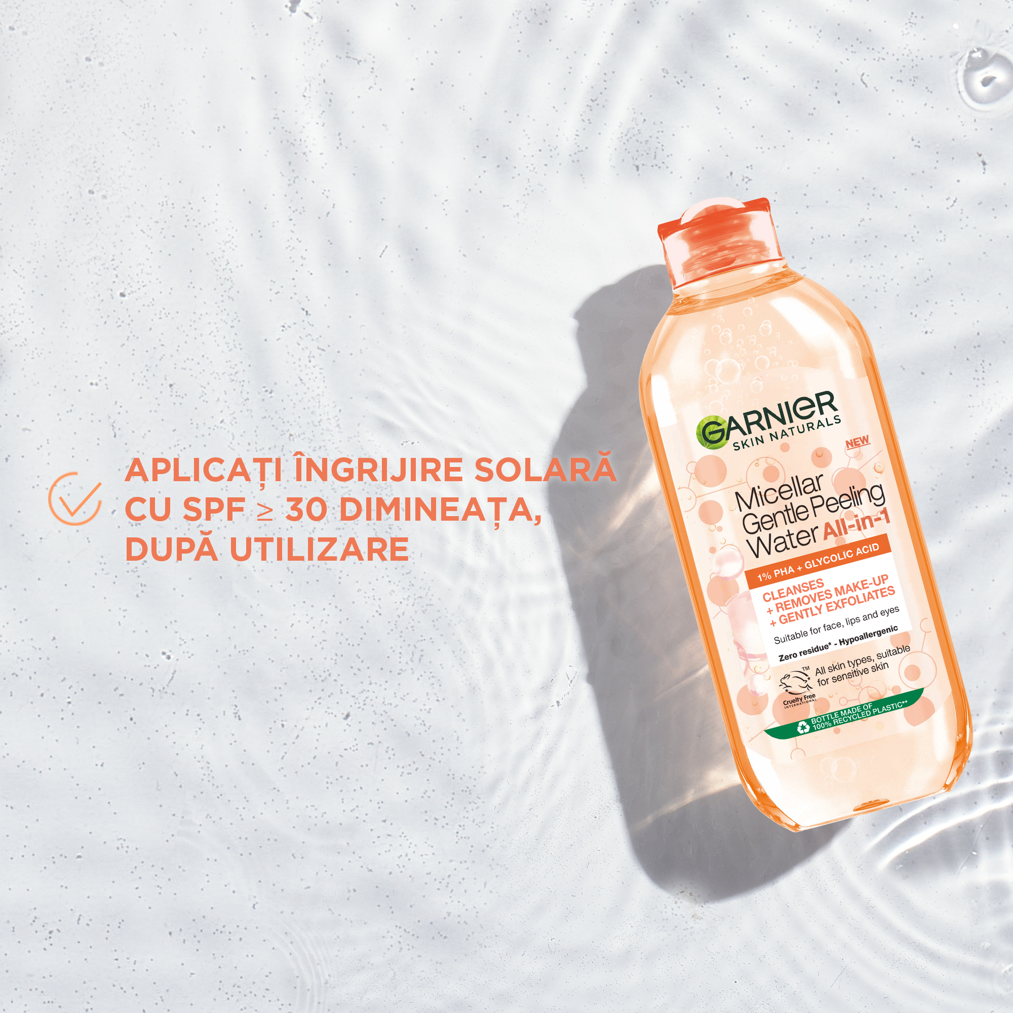 Apa micelara cu efect exfoliant delicat, Curata, demacheaza si exfoliaza delicat.