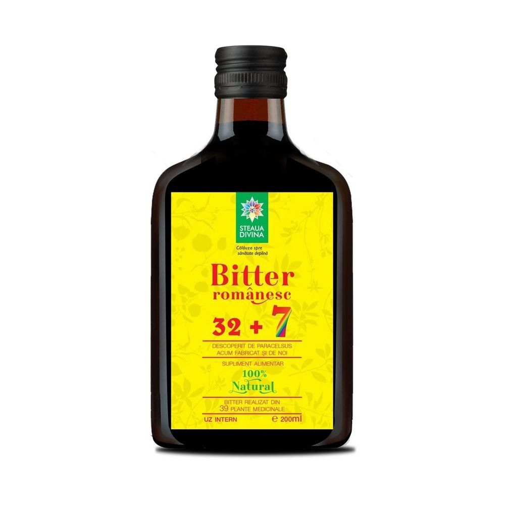 Produs natural, pentru uz intern si extern, obtinut din plante medicinale prin extractie hidro-alcoolica. Fabricat dupa o reteta originala "Steaua Divina", folosind multiple informatii din medicina traditionala si imbunatatind cunoscuta reteta a Mariei Treban, Bitterul romanesc 32+7 este o tinctura polivalenta, cu numeroase aplicatii interne si externe.