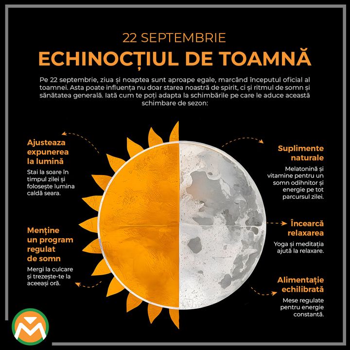 🍃 Echinocțiul de toamnă este aici! Pe 22 septembrie, ziua și noaptea sunt aproape egale, marcând începutul oficial al toamnei. Această schimbare de sezon poate influența nu doar starea de spirit, ci și ritmul nostru de somn și sănătatea generală. Iată cum: