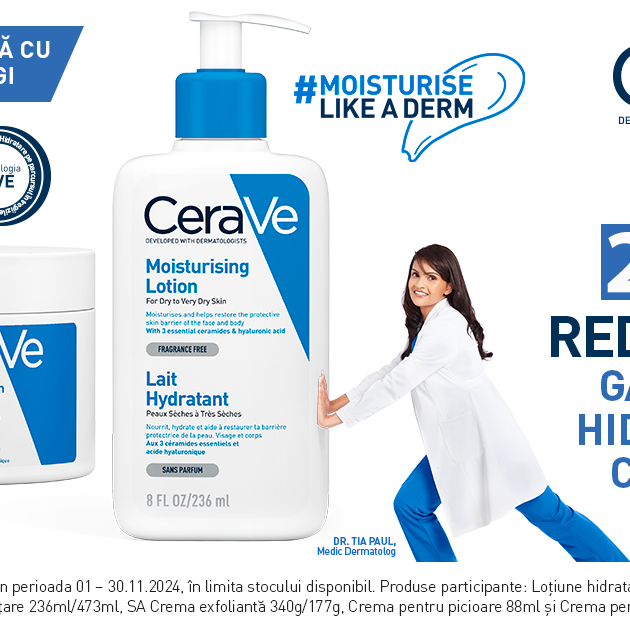 Descoperă gama Cerave cu creme, loțiuni și geluri de curățare hidratante, exfoliante și reparatoare, perfect create pentru pielea uscată și foarte uscată, acum cu 25% reducere. 🌿